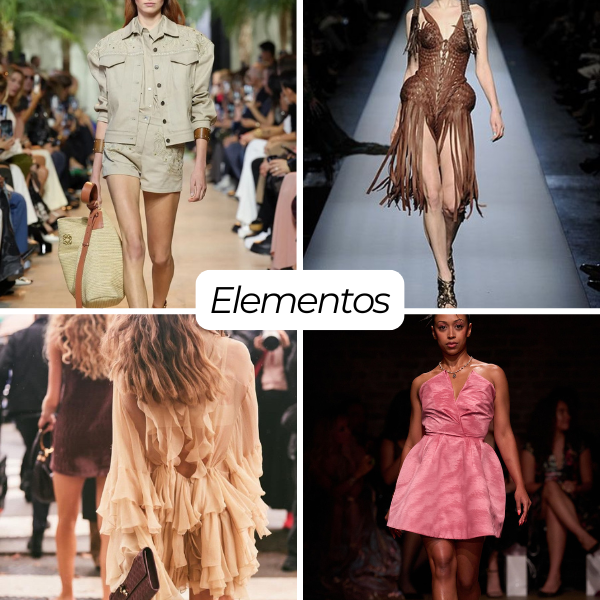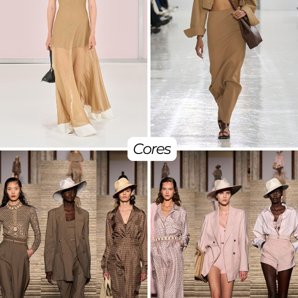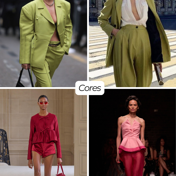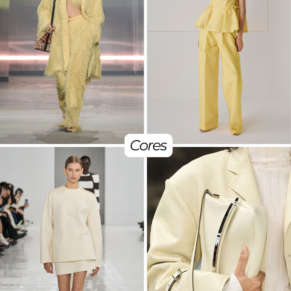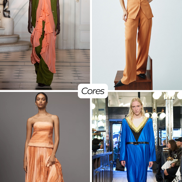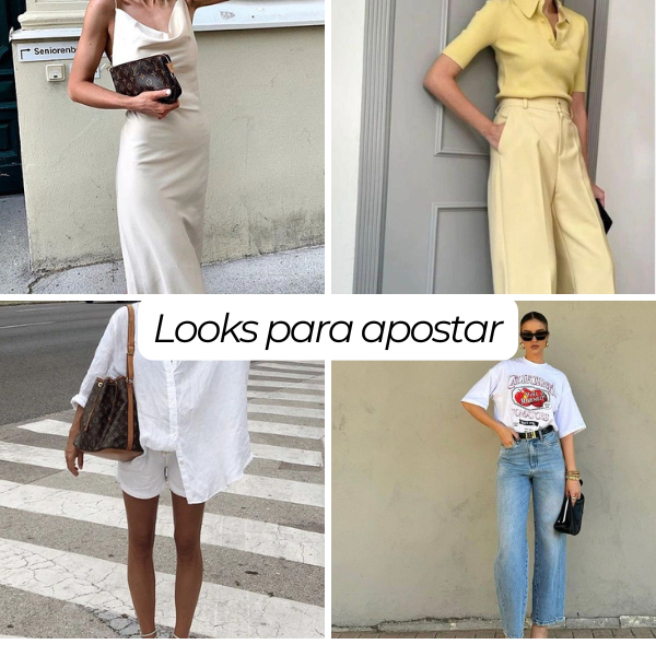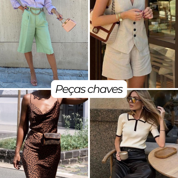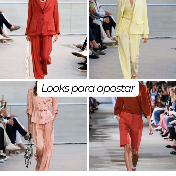 Os tecidos são fluídos ou estruturados na medida certa — linho, cetim, rendas coloridas, crochês e tramados vintage — valorizando shapes-chave como vestidos acinturados, saias lápis, bermudas de alfaiataria, bodies e conjuntos práticos.